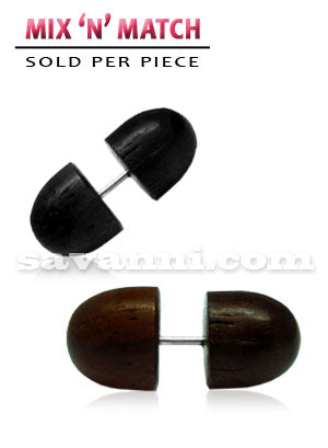 Musta puinen feikkiplugi. Feikkiplugi sopii käytettäväksi normaalissa korvareiässä.