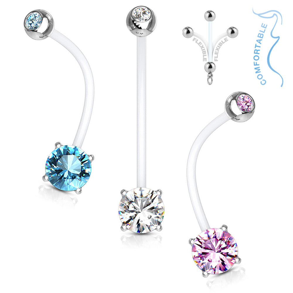 At Savanni we give you a great choice of materials to choose from for your belly piercing. The belly piercings' materials range from surgical steel, silver, gold, Titanium, Bioflex and Bioplast to the colored acrylic ones. In our wide selection of belly button piercing, many of our surgical steel and titanium belly piercing bars are available in thickness size of 1.6mm and in length of 10mm. However, many of our basic belly piercings are also available from extra short 6mm bars up to 20mm long bars.