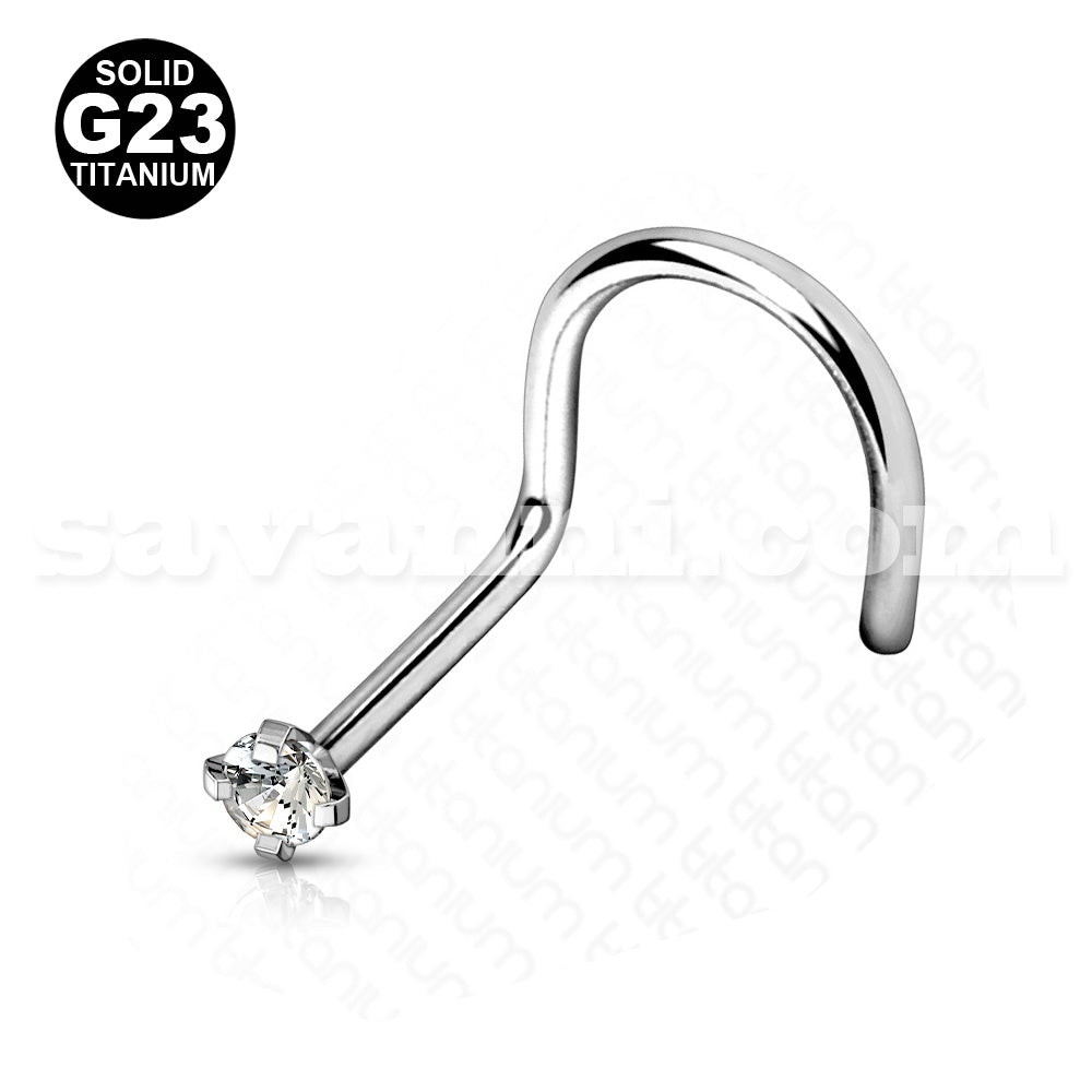 Hopeinen nenäkoru pienellä kirkkaalla strassipäällä. Valmiiksi taivutettu varsi. Varren paksuus 0.6mm ja pään (kiven) koko 1.3mm.