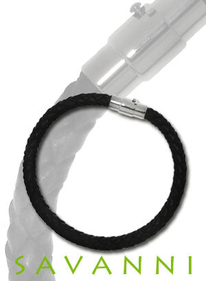 Musta punottu nahkaranneke kolmella teräsrengaskoristeella.