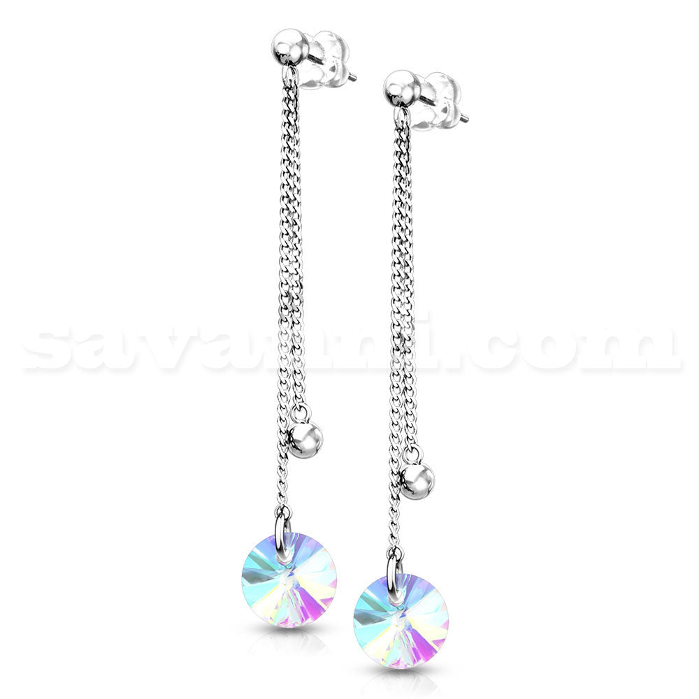 Roikkuvat ja kimaltavat korvakorut, joissa kahden ketjun päässä infinity-riipus. Korvakorujen materiaali on kirurginteräs, 0.8mm paksuisissa tapeissa perhoslukot. Korviksen kokonaispituus noin 40mm. Hinta on parihinta.