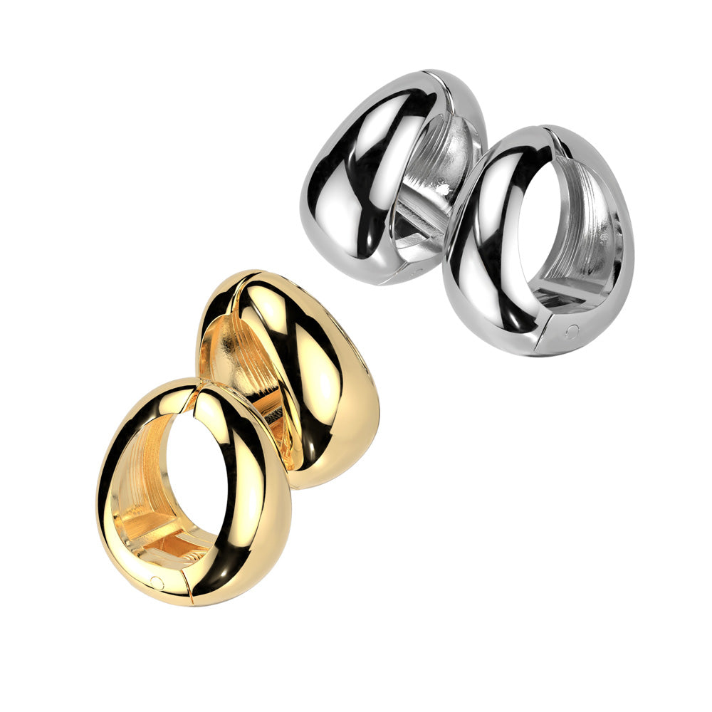 Paksut pisaran muotoiset korvarenkaat laadukkaasta kirurginteräksestä. Saranakiinnitys, korvarengas avataan klikkaamalla auki. Saatavilla teräksen ja kullan värissä. Korvareiän sisään menevän tapin paksuus on 1.0mm. Korvarenkaan koko noin 12mmx15mm. Paksuus (paksuimmasta kohtaa) noin 8mm. Hinta on parihinta.