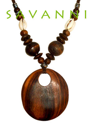 Kaulakoru helmikoristeilla, puuvillanauhoilla ja isolla puuriipuksella. Kaulakorun luonnonmateriaalien koko ja kuviointi voivat vaihdella hieman. Valitse puukaulakorun puuvillanauhojen väri valikosta.